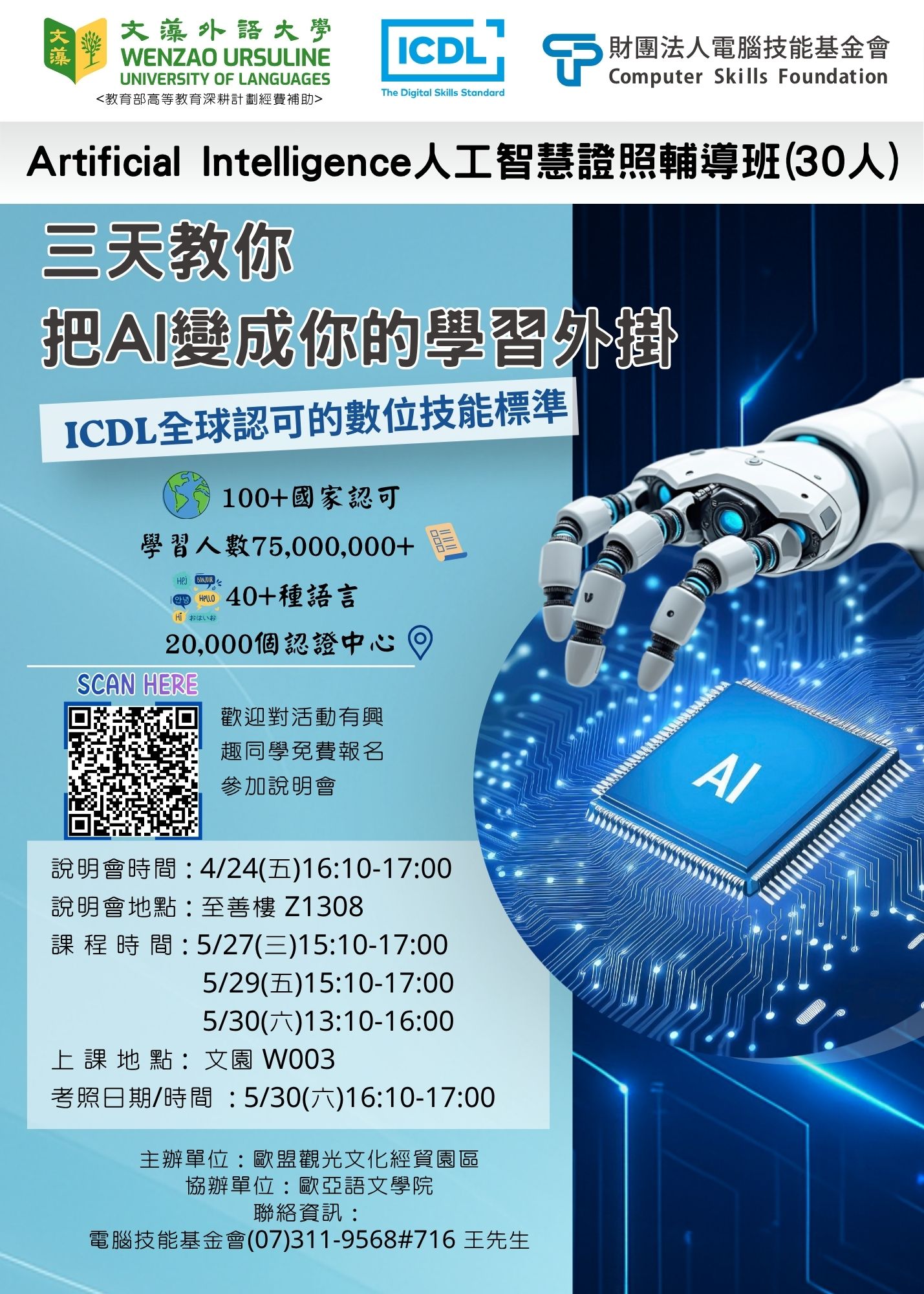 【轉知】歐盟園區舉辦「ICDL Artificial Intelligence 人工智慧證照輔導說明會」(4/24、16:10~17:00)_歡迎有興趣的同學報名參加!