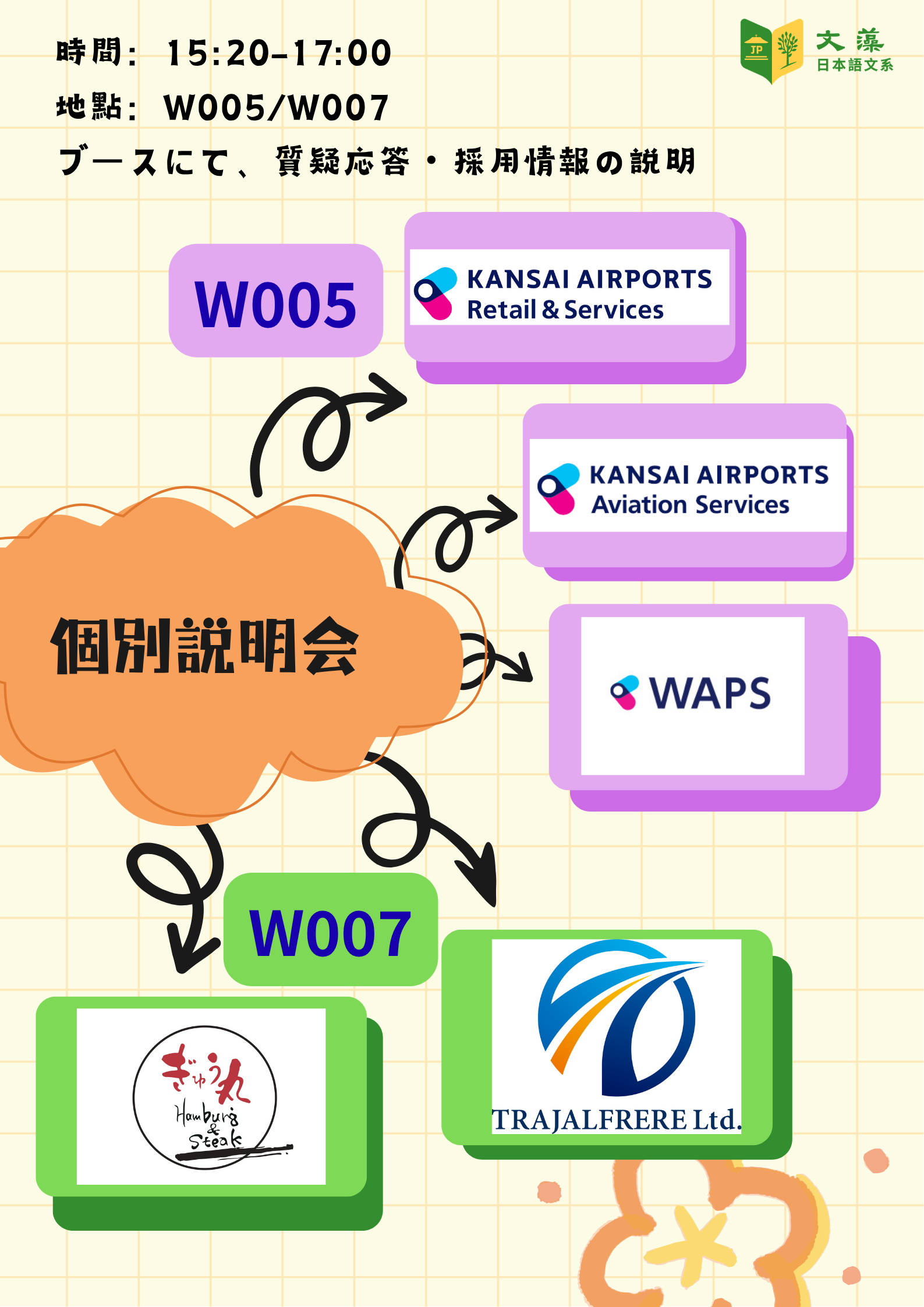 15:20-17:00 個別說明會(地點W005、W007):學生可個自至廠商攤位詢問相關徵才問題。