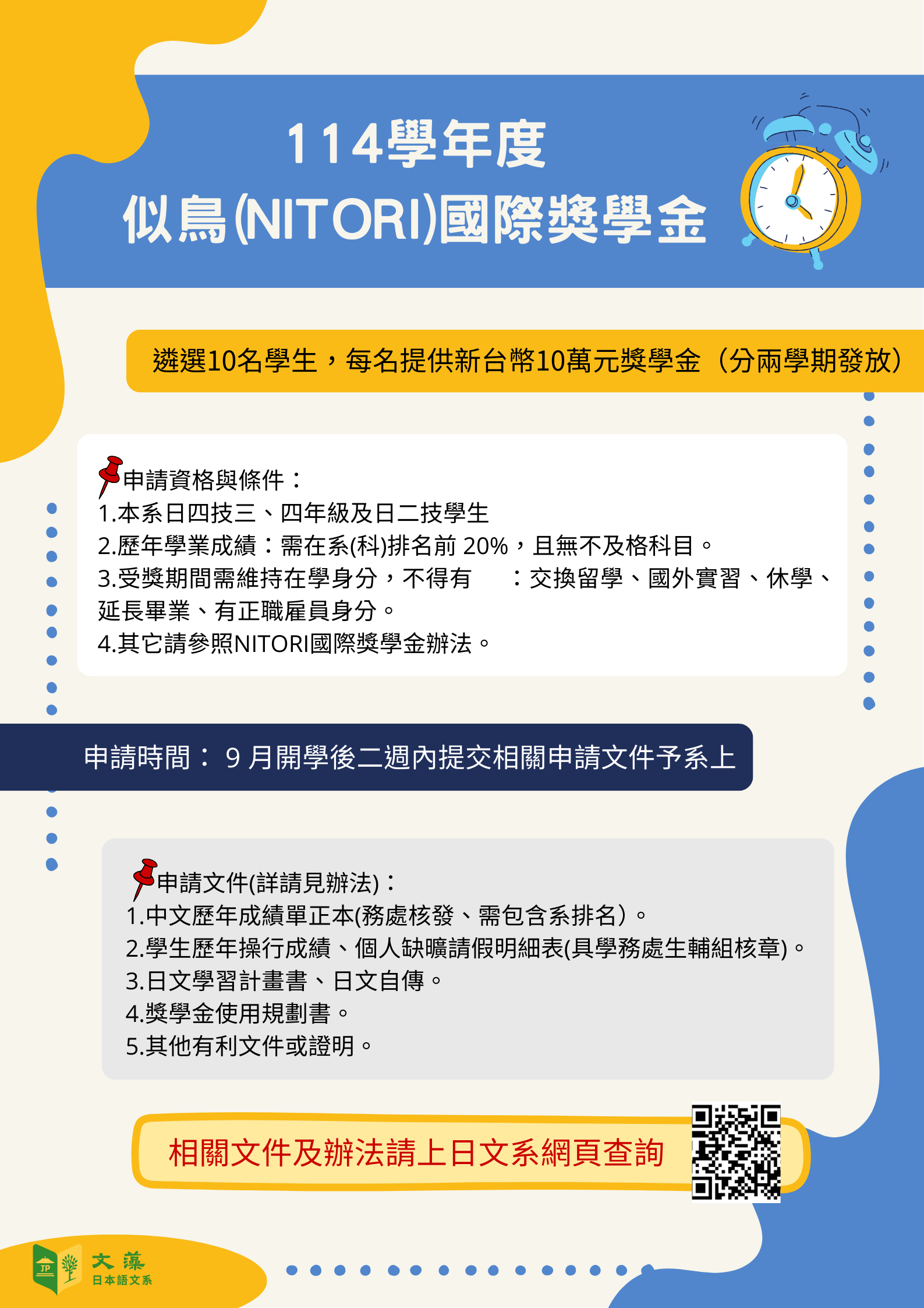 【NITORI獎學金】114學年度似鳥(NITORI)國際獎學金申請說明,請符合資格的學生踴躍提出申請!