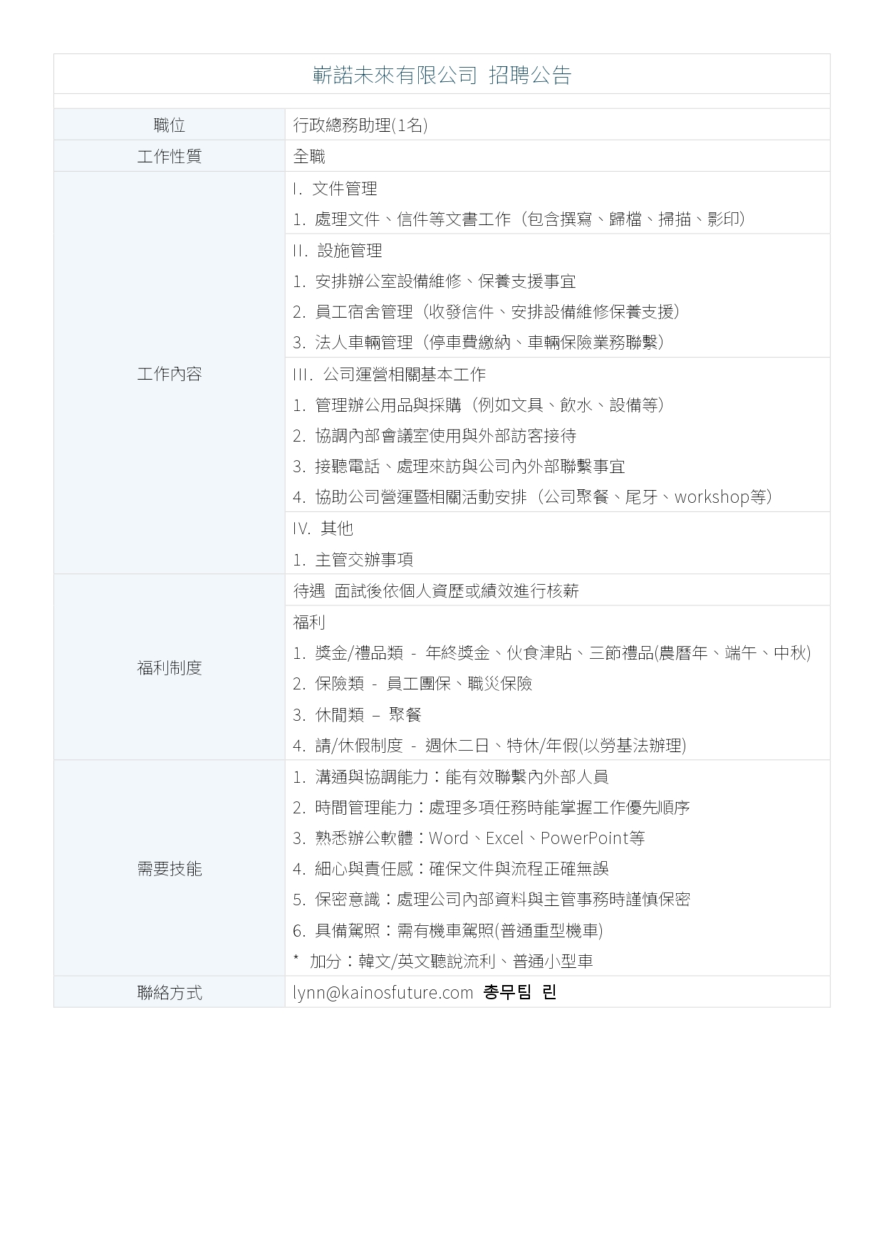 (轉知)【福一國際股份有限公司辦公室事務員(可兼職/可正職)】 2025.4.30公告 |